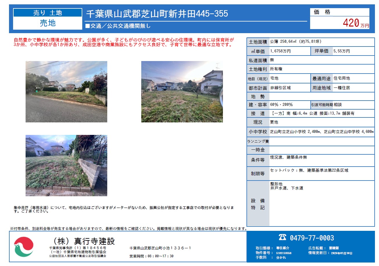 ホーム 物件情報 建築条件なし 山武郡芝山町新井田 はにわ台土地 お気に入り物件一覧 建築条件なし 山武郡芝山町新井田 はにわ台土地 お気に入りに登録する 解除する この物件の 資料請求 来場予約 基本情報 コンセプト ランドプラン 立地・周辺環境 アクセス 間取り 一覧へ戻る 0479-77-0003 受付/8:00~17:30 定休日/土曜、日曜、祝日 お気に入り一覧を見る この物件の来場予約 この物件の資料請求 電話