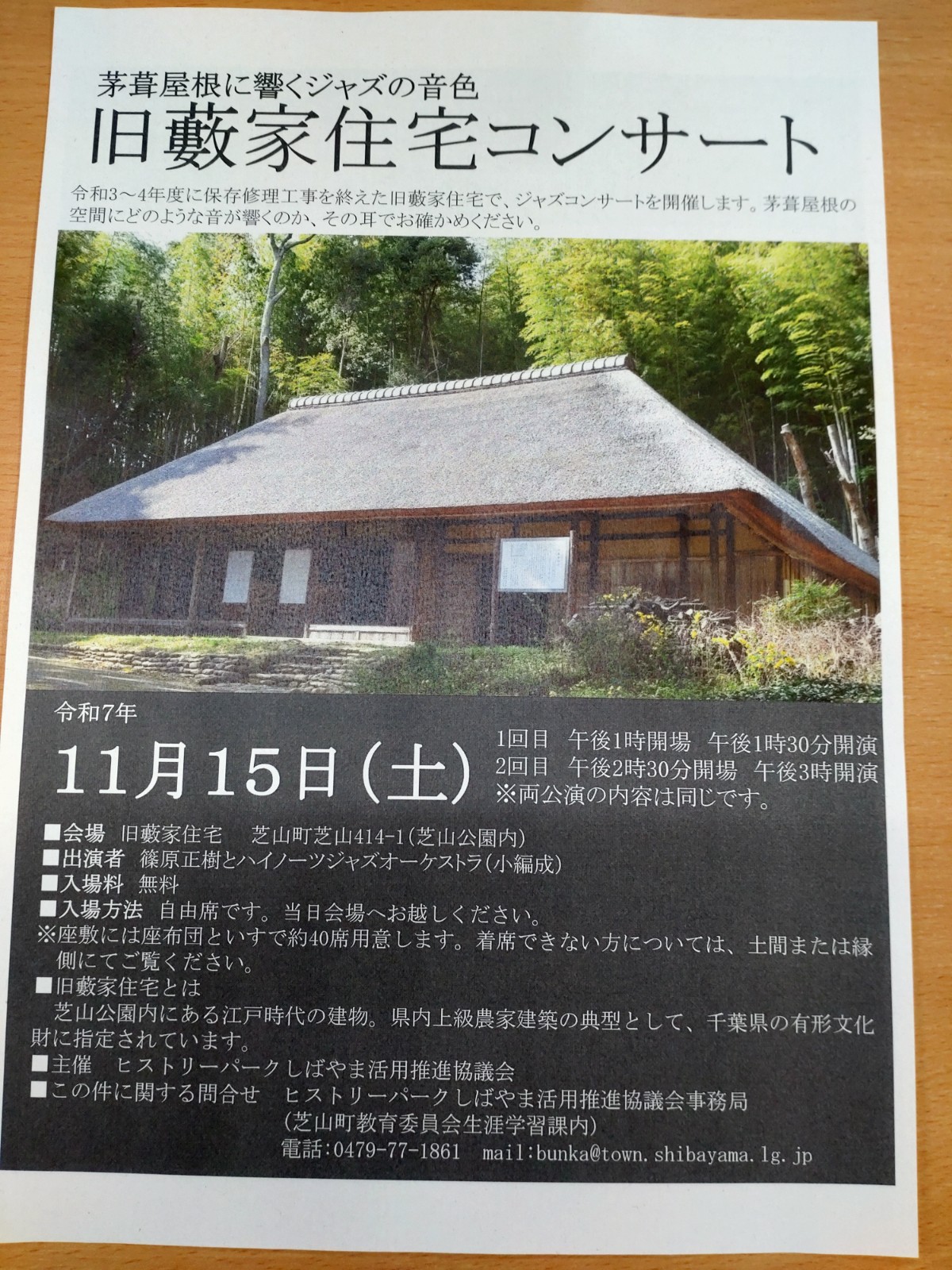 弊社で保存修理を行った芝山町の「旧藪家住宅」にて、無料のジャズコンサートが開催されます。